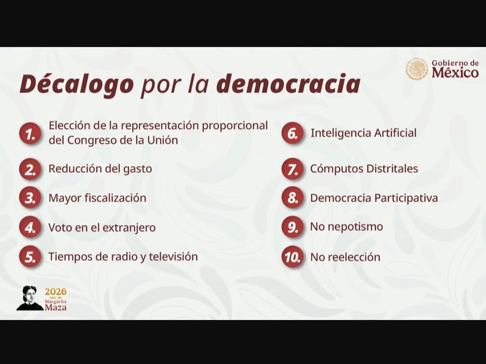 Entre los otros puntos del decálogo se incluyen voto para mexicanos en el extranjero en diputaciones de representación proporcional, reducción de tiempos de radio y televisión en campañas, uso regulado de inteligencia artificial en propaganda política, cómputos distritales más eficientes, impulso a la democracia participativa, prohibición del nepotismo y la no reelección.