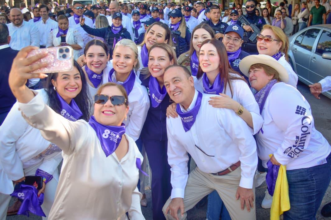 Los Mochis, Ahome, Sinaloa. A 06 de Marzo de 2026.- En el marco de la conmemoración del Día Internacional de las Mujeres, el Ayuntamiento de Ahome realizó la marcha “Derechos, Justicia y Acción por y para todas las mujeres y niñas”, encabezada por el Presidente Municipal, Antonio Menéndez de Llano Bermúdez, acompañado de su hija Marissa Menéndez de Llano Chávez, Presidenta del Sistema DIF Ahome, así como de funcionarias, trabajadoras del Ayuntamiento y diversas mujeres de la sociedad civil que se sumaron a esta movilización.